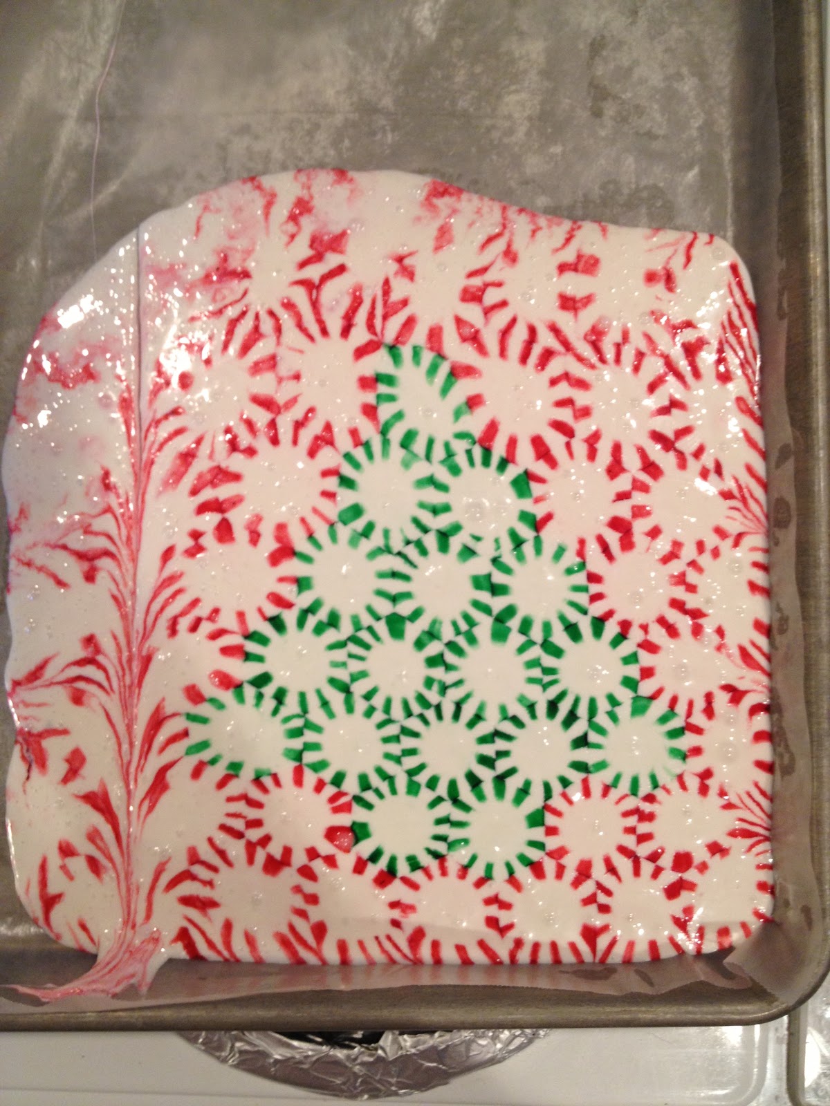 I put it in the oven and set the timer for 8 minutes. Around the 7 minute mark the peppermints started smoking like crazy and the edges were bubbling so I quickly pulled it out. Fortunately it looked fine and didn't have any scorch marks.